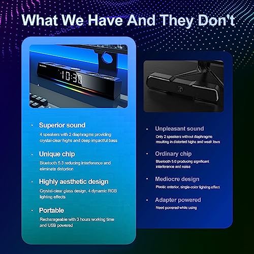 ✅【4 Ways to Connect】Support Bluetooth 5.3 connection, 3.5mm Aux-in wired connection, TF card connection and USB connection. The computer soundbar is widely compatible to various devices, such as computer, laptop, tablet, monitors, smartphones and TV.