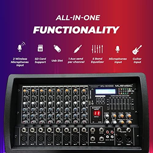 8-channel professional power mixer, perfect for podcast soundboards and recording mixers. It offers mono inputs for microphones and 2 stereo inputs for devices like CD players. it’s ideal for high-demand settings like live music mixing boards and DJ mixer boards