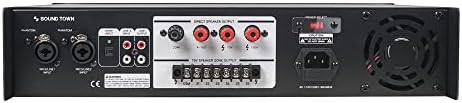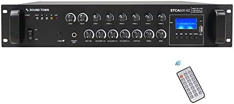 Sound Town 6-Zone 70V/100V Commercial Amplifier with Bluetooth, Phantom Power, Optical, 600 Watts, for Restaurants, Bars, Cafes, Schools, Churches, Black The Sound Town STCA600-6Z is a 6-zone 19” rack mountable commercial power amplifier. It comes with 600W RMS output and can be split into 6 zones. Its integrated clipping limiter protects your speakers and amp from overheating. Even better, it is capable of 70-volt, 100-volt, 8-ohm, and 4-ohm and is ideal for applications such as restaurants, bars, pubs, schools and warehouse. The multi-zone power amplifier comes with 2 RCA inputs, 3 mic inputs, Optical (SPDIF) input, SD card and Bluetooth, USB, FM radio and RCA line output, 70V / 100V / 4~16-ohm red positive speaker output terminals and shared negative speaker output terminal. The amplifier’s versatile input and output options allow you to easily set this up in a variety of multi-room applications. Each of the 3 mics input has echo control and all 6 zones have separate volume knobs for easy adjustment. Two mic inputs are also phantom powered and compatible with condenser microphones.
