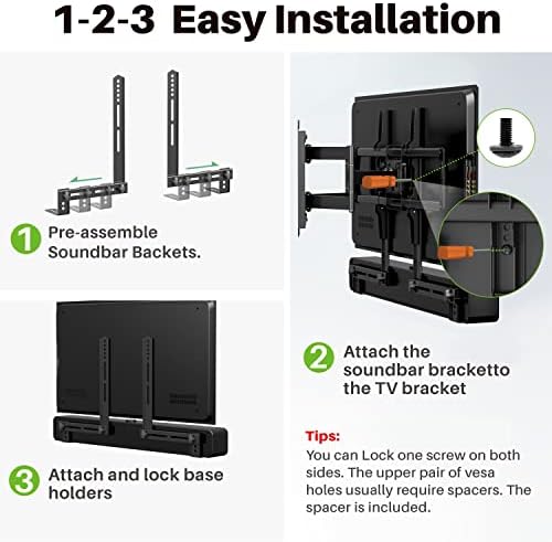 【EASY INSTALLATION】1. Pre-assemble soundbar Backets. 2. Attach the soundbar brackets to the TV brackets. (Tips: You can lock one screw on each side. The top pair of holes generally require use of a spacer.) 3. Attach and lock base holders without need to drill holes in the wall.
